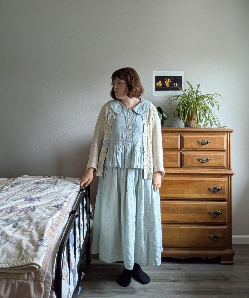 Wearing my much mended secondhand cotton cardigan and a blouse and skirt sewn from a secondhand linen duvet cover (blouse is adapted from the Matchy Matchy High Tide set).